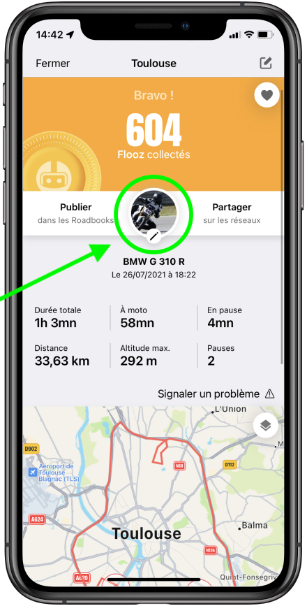 - Cliquer sur le rond avec une photo de moto entre "Publier" et "Partager"